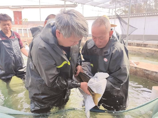 “来来来,把太阳伞打开,不要让阳光照射鱼卵。”大理州渔业工作站站长李志洪一边让技术人员撑开太阳伞,一边有条不紊地挑选着准备人工挤卵的雌鱼。