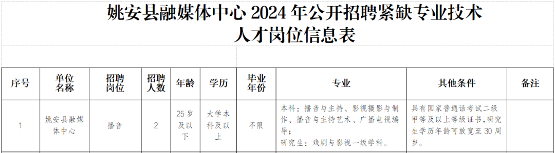 姚安县融媒体中心2024年紧缺专业技术人才招聘公告