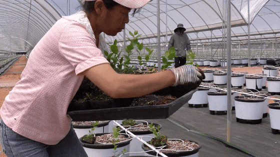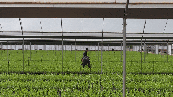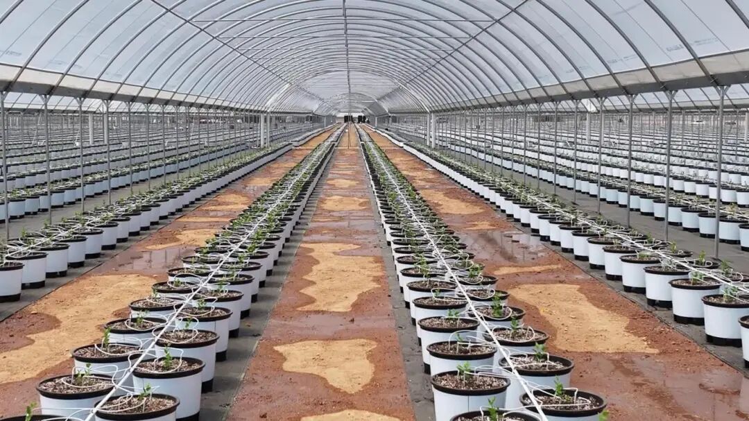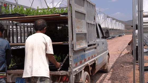 我们今年目前已经移栽了20万株,总的是要移栽72万株,到5月15日之前要全部移栽完成,基本上平均是每天1.5万到2万株的定植速度,预计到今年12月份就可以采摘。