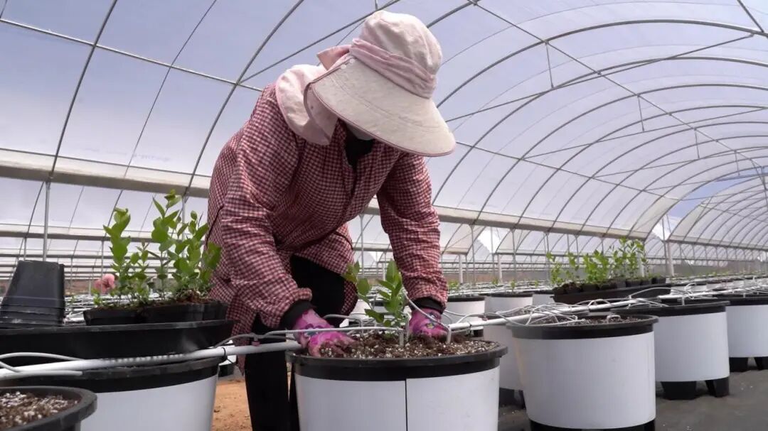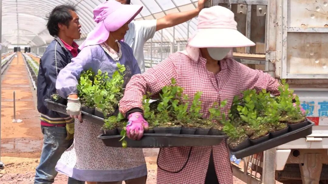 运苗、分苗、定植……工人们正忙碌地进行着蓝莓幼苗移栽,他们各司其职、相互配合,移栽工作进行得有条不紊。