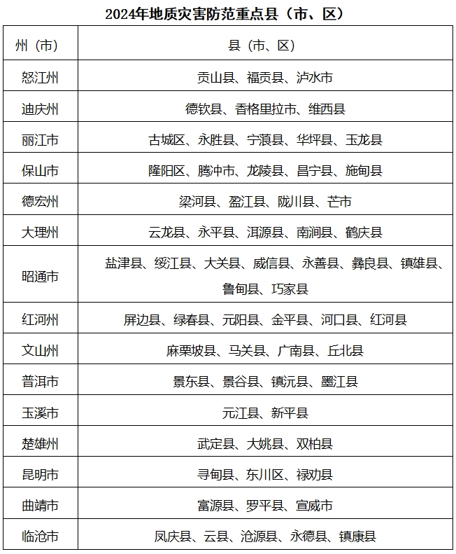 2024年云南省受地质灾害威胁较大需重点防范的县(市、区)共64个,详见下表。