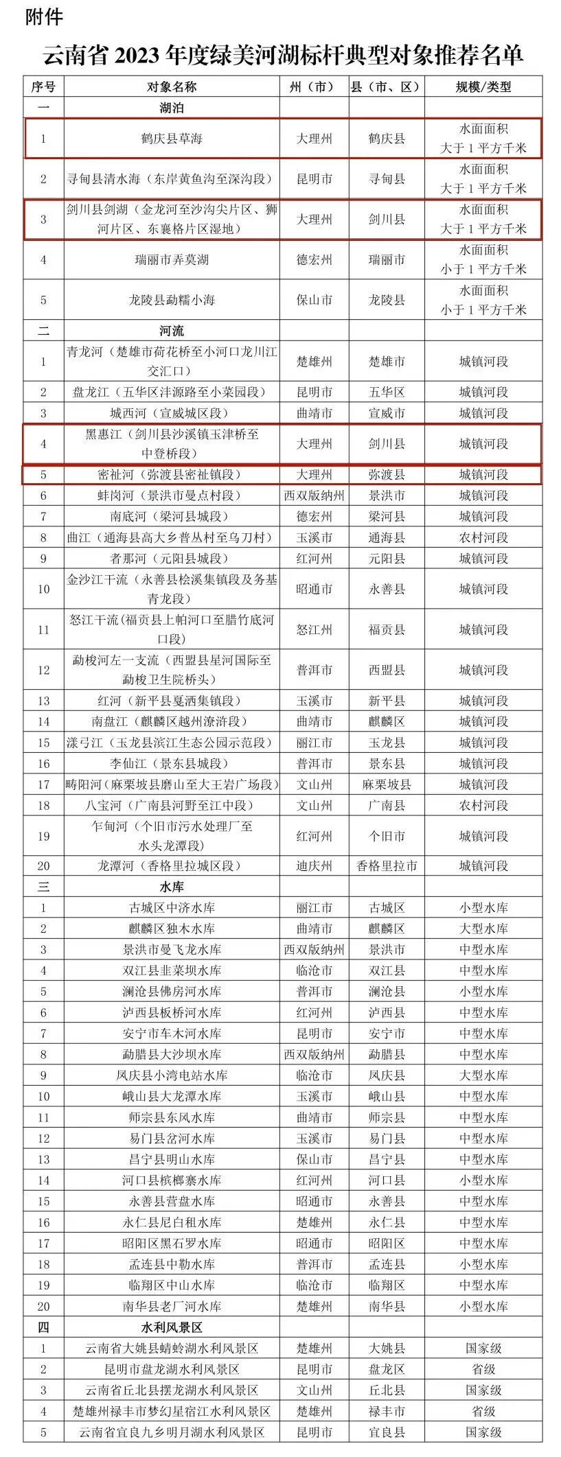 附件:云南省2023年度绿美河湖标杆典型对象推荐名单