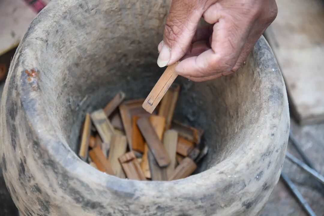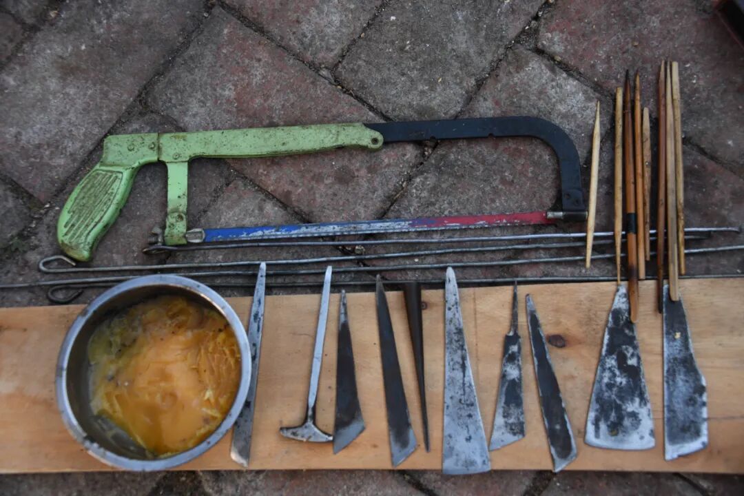 各种型号的小刀、锯片、烙条、竹签……一个放工具的小箱子,就是茶玉堂制作芦笙的全部家当,小小的农家院就是他的作坊,屋子里放满了刚制作好的芦笙。