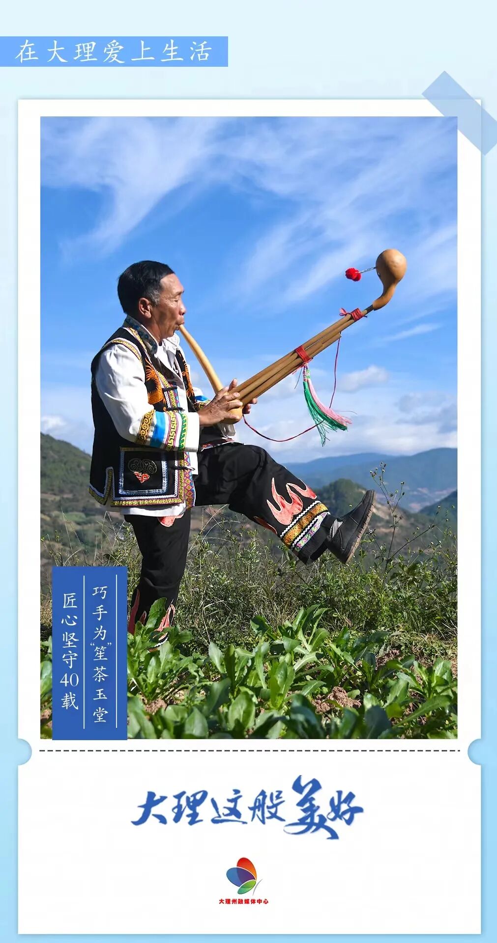 蓝天白云之下,茶玉堂在家门前的山地吹着刚制好的芦笙,乐声如同天籁之音在村庄上空回荡,那是彝家人的乡恋,更是彝家人永远磨灭不掉的乡愁。