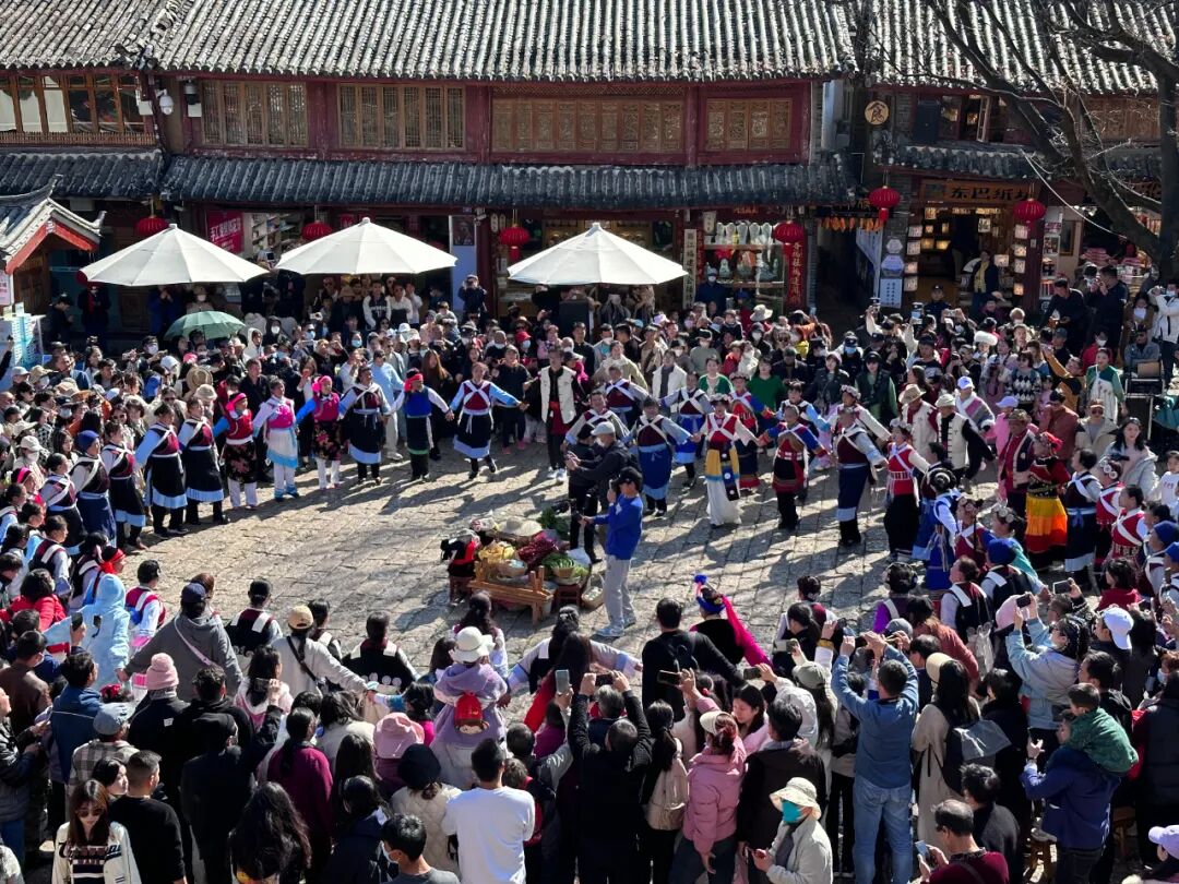 游客在丽江古城打跳。(丽江融媒记者 钱磊 摄)