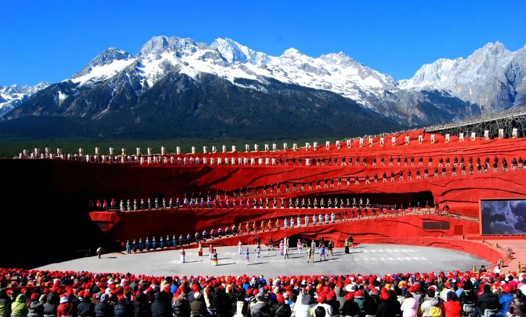 游客在玉龙雪山脚下观看《印象·丽江》实景演出。(丽江融媒记者 赵庆祖 摄)