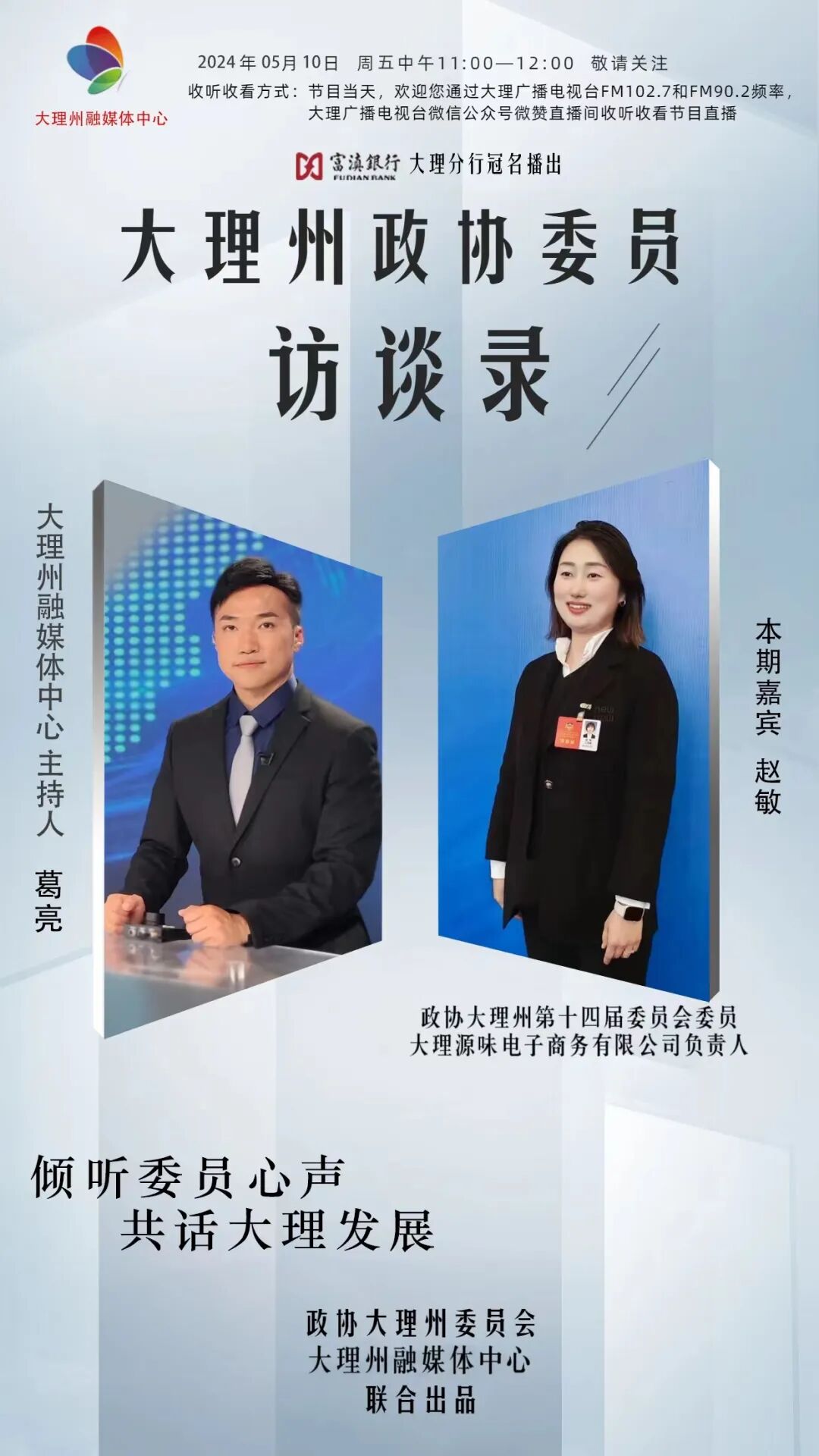 今天上午11点,《大理州政协委员访谈录》邀请政协大理州第十四届委员会委员,云南大理源味电子商务有限公司负责人赵敏,就自己的创业经历、大理州农产品销售等内容进行分享,并就关注民生、三农电商发展助力乡村产业发展,认真履行委员职责等方面进行交流探讨。