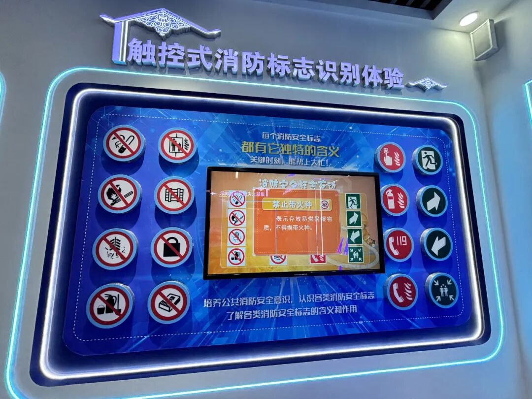 在这个区域,我们用手触摸安全标识后,设备将播放标识的相关内容,这时,我们便可进行答题闯关互动,通过触控式、趣味性和知识性的方式,让大家能够更直观的了解消防安全标识。