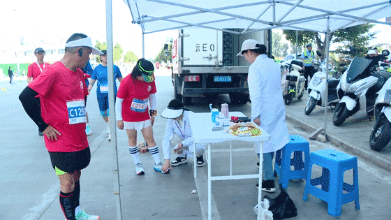 作为医护人员,我们的工作就是保持清醒的头脑,观察运动员,及时处理突发情况并采取相应措施。处理得比较多的情况就是脚抽筋,我们第一时间会帮助运动员将小腿绷直,再用冰袋局部冷敷,按摩,这样运动员基本就能很快恢复,重返赛道。