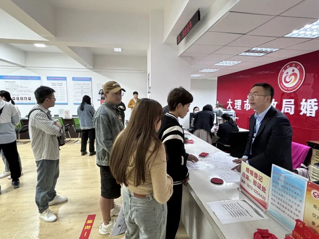 为满足情侣们的结婚登记需求,大理市民政局婚姻登记处,在节前就实行了“网上预约+线下预约”模式,同时还增加了相应的工作人员。