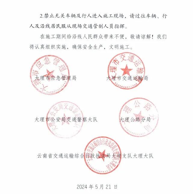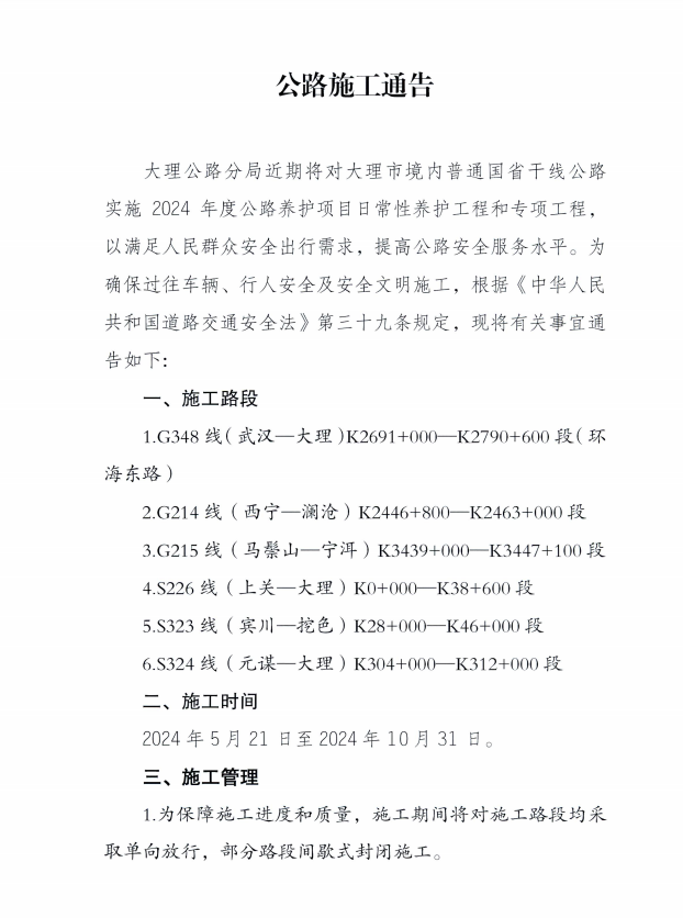 大理公路分局近期将对大理市境内普通国省干线公路实施2024年度公路养护项目日常性养护工程和专项工程,以满足人民群众安全出行需求,提高公路安全服务水平。为确保过往车辆、行人安全及安全文明施工,根据《中华人民共和国道路交通安全法》第三十九条规定,现将有关事宜通告如下:
