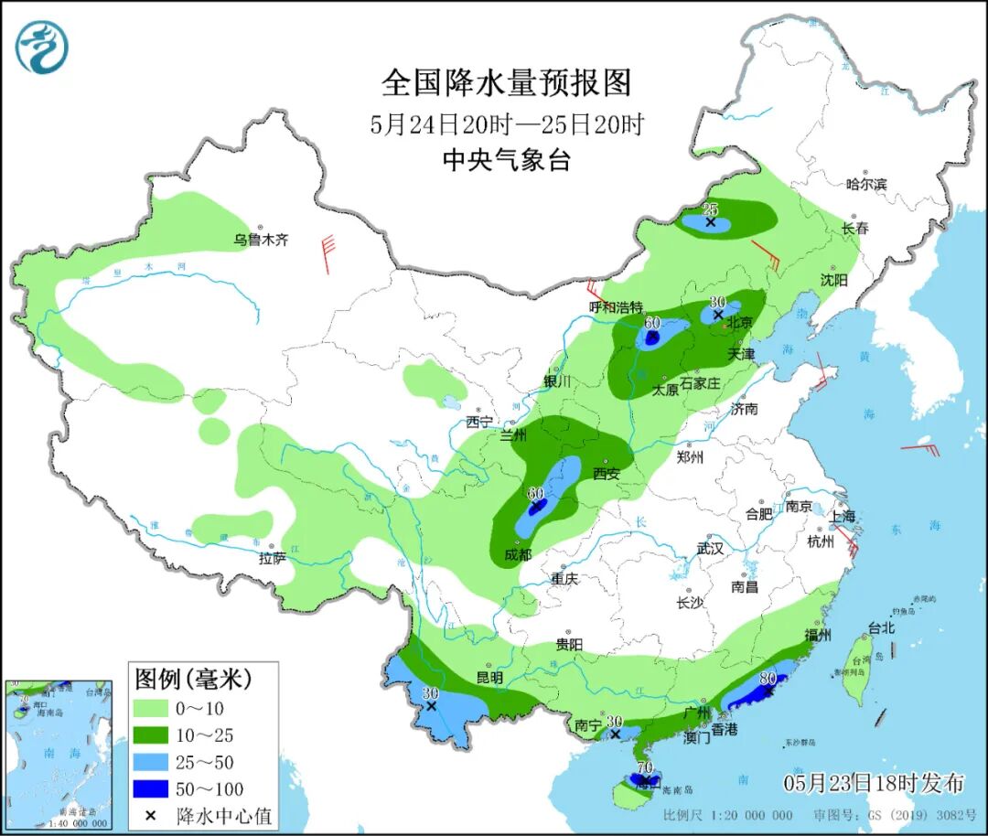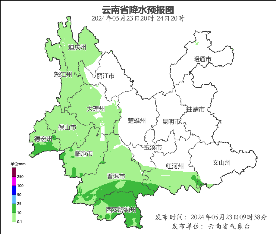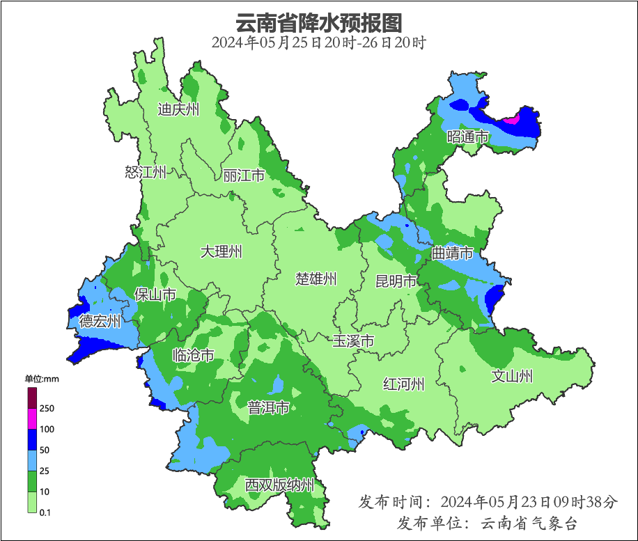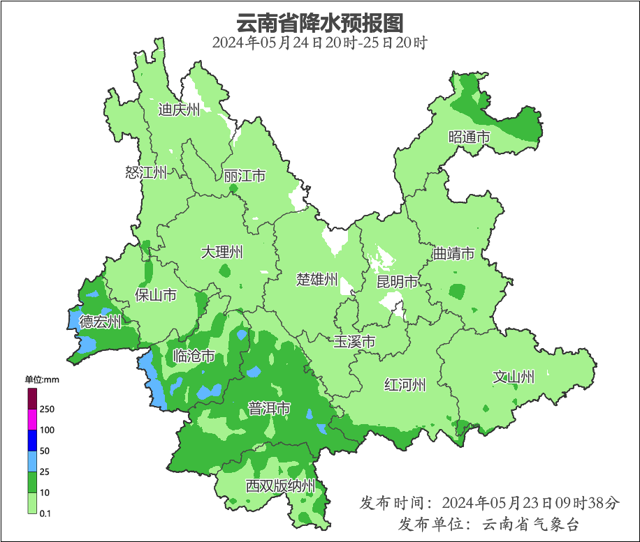 2024年5月23日20:00~5月24日20:00,昆明市西北部,楚雄州东北部,大理州中部发生滑坡泥石流的风险较高。