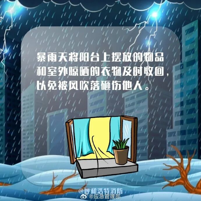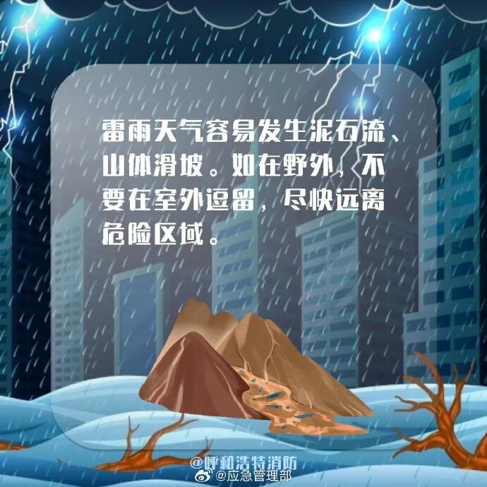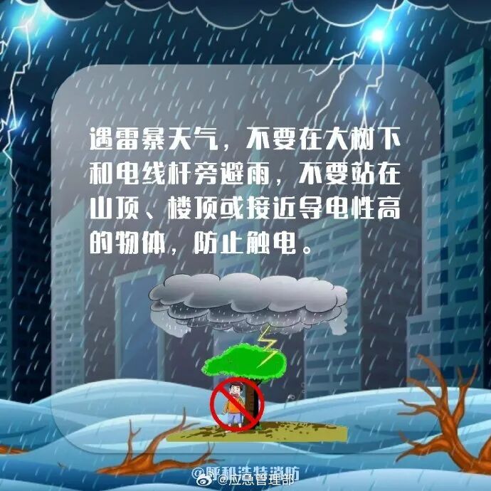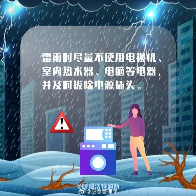 3.户外人员应减少或暂停空旷地方的户外作业,选择进入抗风能力较强并具有防雷措施的建筑内,同时关闭门窗远离危险电源;