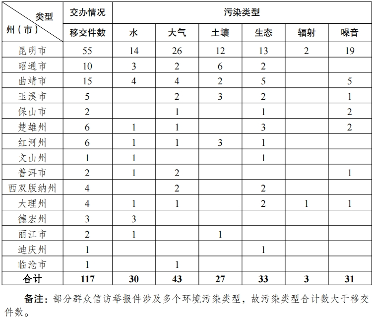 云南省中央生态环境保护督察群众来信来电举报污染类型统计表