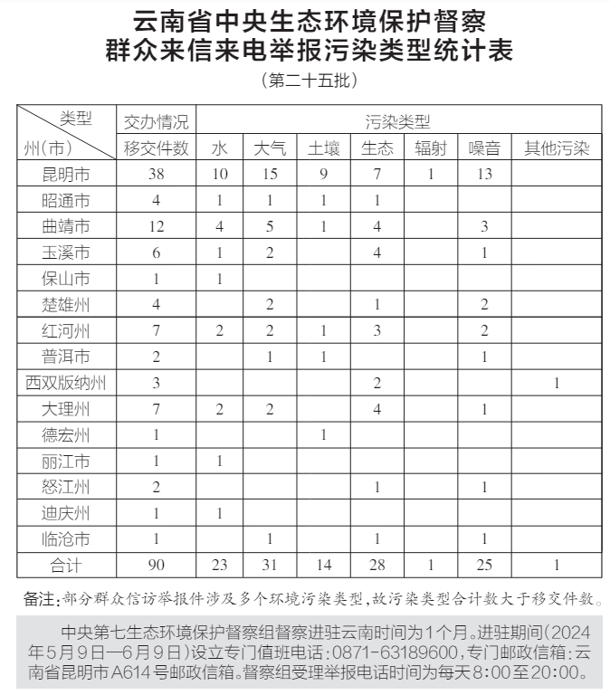 6月3日,中央第七生态环境保护督察组向云南移交第二十五批群众信访举报件90件,其中来电举报46件,来信举报44件。从信访举报件生态环境问题污染类型来看,涉及水23件、大气31件、土壤14件、生态28件、辐射1件、噪音25件、其他污染1件。从区域分布上看,昆明市38件、昭通市4件、曲靖市12件、玉溪市6件、保山市1件、楚雄州4件、红河州7件、普洱市2件、西双版纳州3件、大理州7件、德宏州1件、丽江市1件、怒江州2件、迪庆州1件、临沧市1件。截至当日,云南省已累计收到中央第七生态环境保护督察组交办的信访举报件2380件,所有举报件均已及时转交相关州(市)处理。