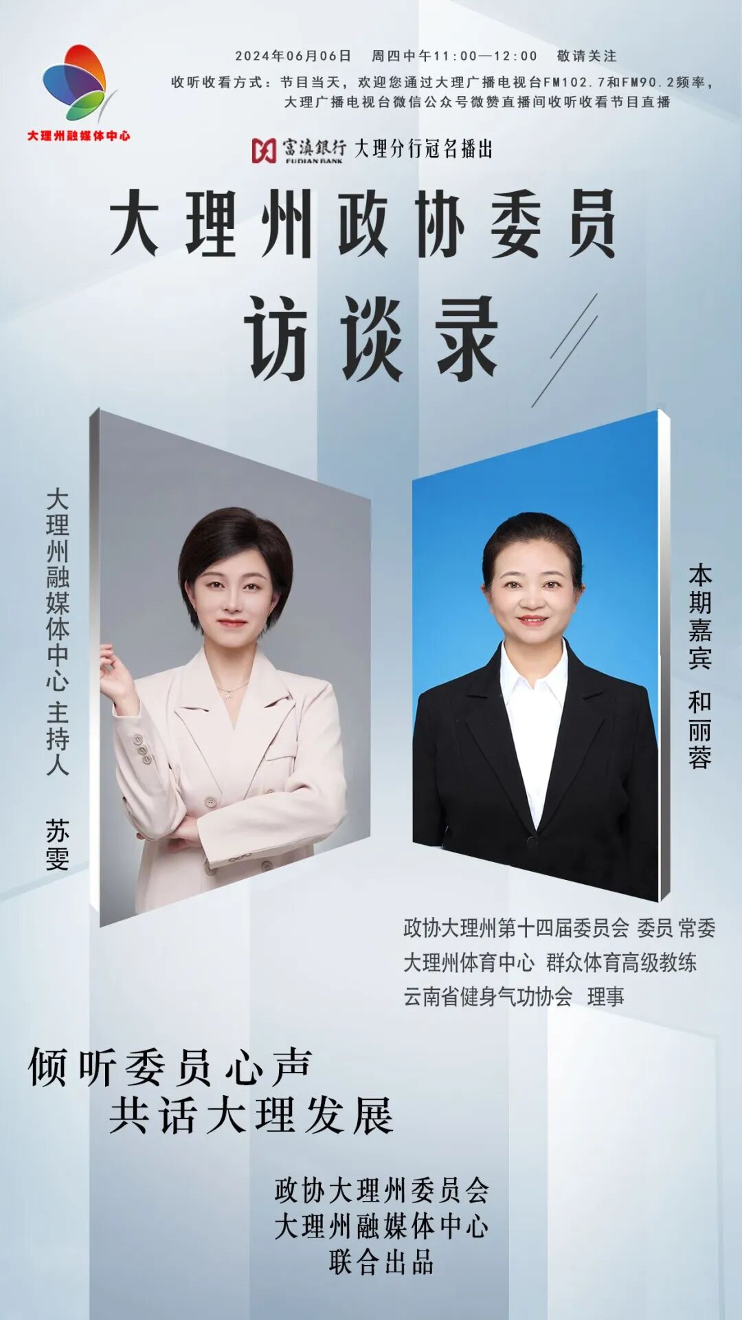 今天上午11点至12点,第091期《大理州政协委员访谈录》邀请政协大理州第十四届委员会委员、常委,大理州体育中心群众体育高级教练、云南省健身气功协会理事和丽蓉,就大理州如何落实《全民健身计划纲要》,推动群众体育运动做交流探讨!