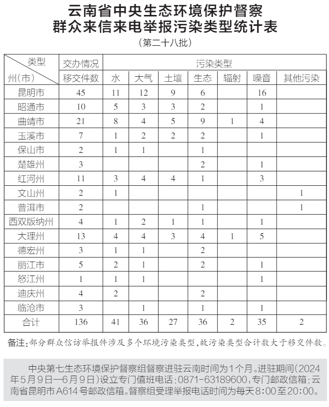 6月6日,中央第七生态环境保护督察组向云南移交第二十八批群众信访举报件136件,其中来电举报56件,来信举报80件。从信访举报件生态环境问题污染类型来看,涉及水41件、大气36件、土壤27件、生态36件、辐射2件、噪音35件、其他污染2件。从区域分布上看,昆明市45件、昭通市10件、曲靖市21件、玉溪市7件、保山市2件、楚雄州3件、红河州11件、文山州2件、普洱市2件、西双版纳州4件、大理州13件、德宏州3件、丽江市5件、怒江州1件、迪庆州4件、临沧市3件。截至当日,云南省已累计收到中央第七生态环境保护督察组交办的信访举报件2730件,所有举报件均已及时转交相关州(市)处理。