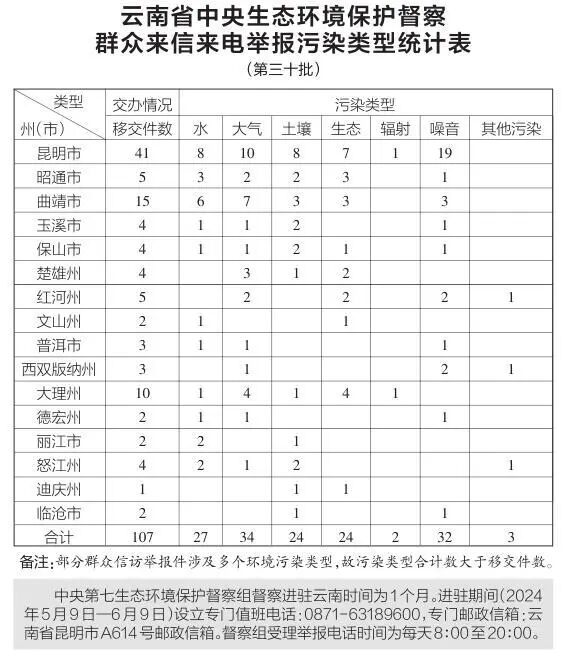 6月8日,中央第七生态环境保护督察组向云南移交第三十批群众信访举报件107件,其中来电举报44件,来信举报63件。从信访举报件生态环境问题污染类型来看,涉及水27件、大气34件、土壤24件、生态24件、辐射2件、噪音32件、其他污染3件。从区域分布上看,昆明市41件、昭通市5件、曲靖市15件、玉溪市4件、保山市4件、楚雄州4件、红河州5件、文山州2件、普洱市3件、西双版纳州3件、大理州10件、德宏州2件、丽江市2件、怒江州4件、迪庆州1件、临沧市2件。截至当日,云南省已累计收到中央第七生态环境保护督察组交办的信访举报件2941件,所有举报件均已及时转交相关州(市)处理。群众信访举报交办件的办理情况将按照相关要求反馈到督察组,整改和处理情况会及时向社会公开。