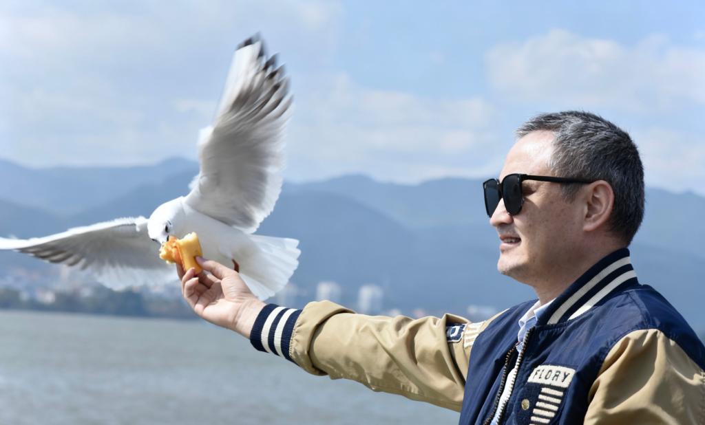 10月28日,昆明滇池边海埂大坝上,游客在喂食红嘴鸥。新华社记者王贤思 摄