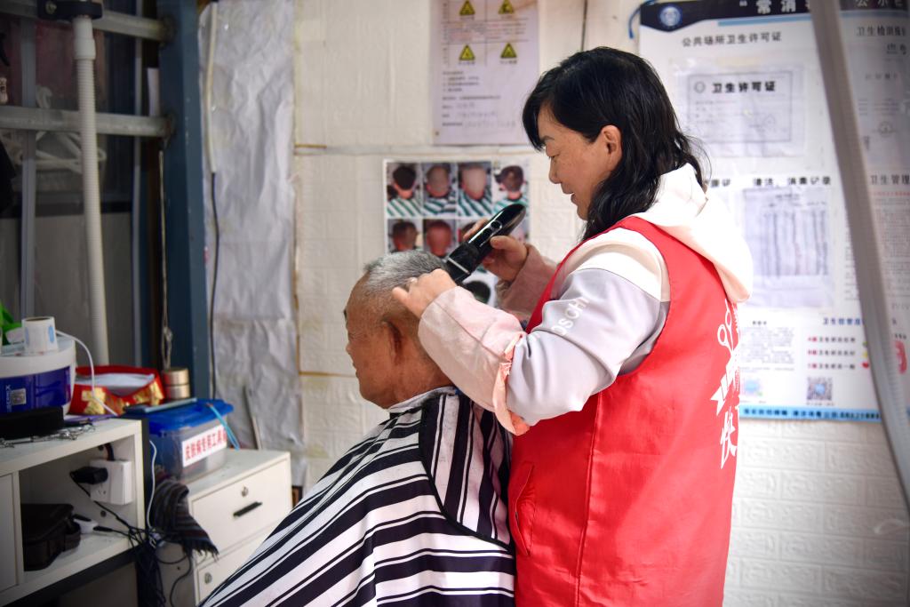 10月28日,昆明市五里多农博广场的便民理发店内,一位老人在理发。新华社记者王贤思 摄