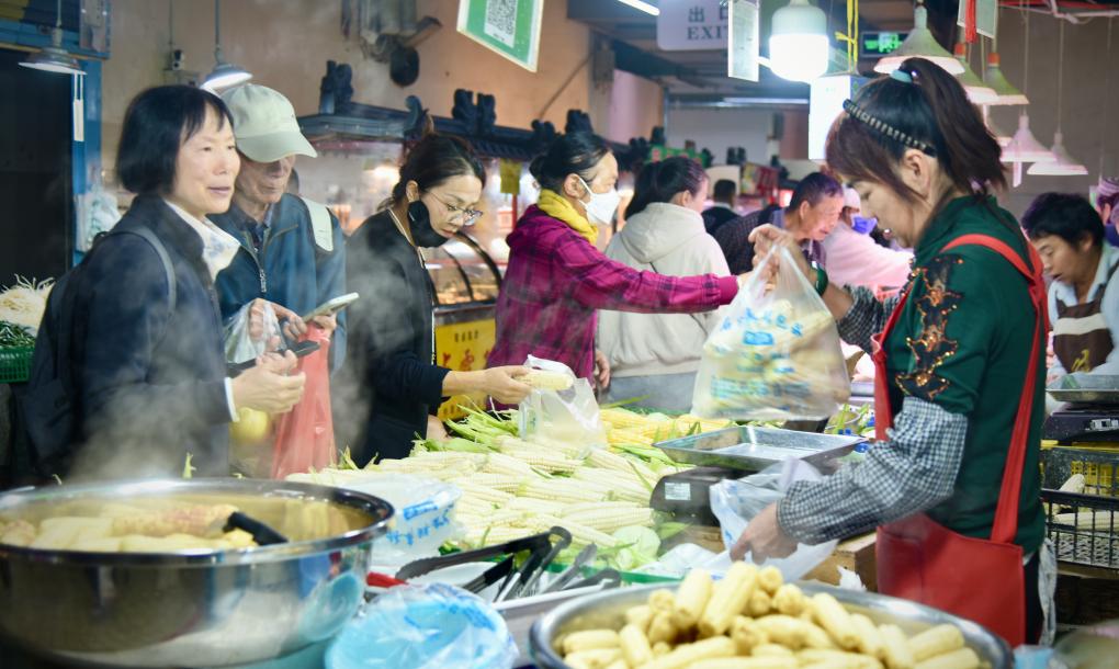 10月28日,昆明市五里多农博广场内,顾客在摊位前选购玉米。新华社记者王贤思 摄