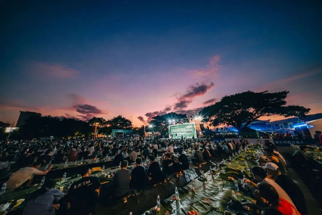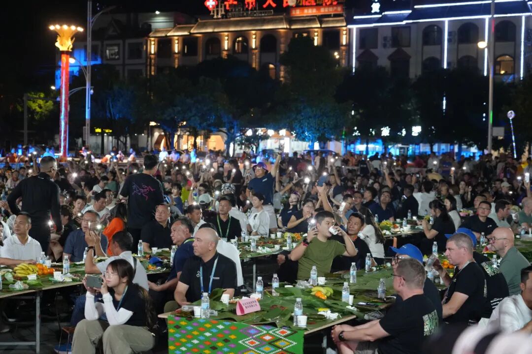 晚上7点,欢迎晚宴上,近1900名来自21个国家和地区的参赛选手和嘉宾们欢聚芒市广场,围坐绿叶铺垫的长桌边,品美食、赏歌舞、话心情。
