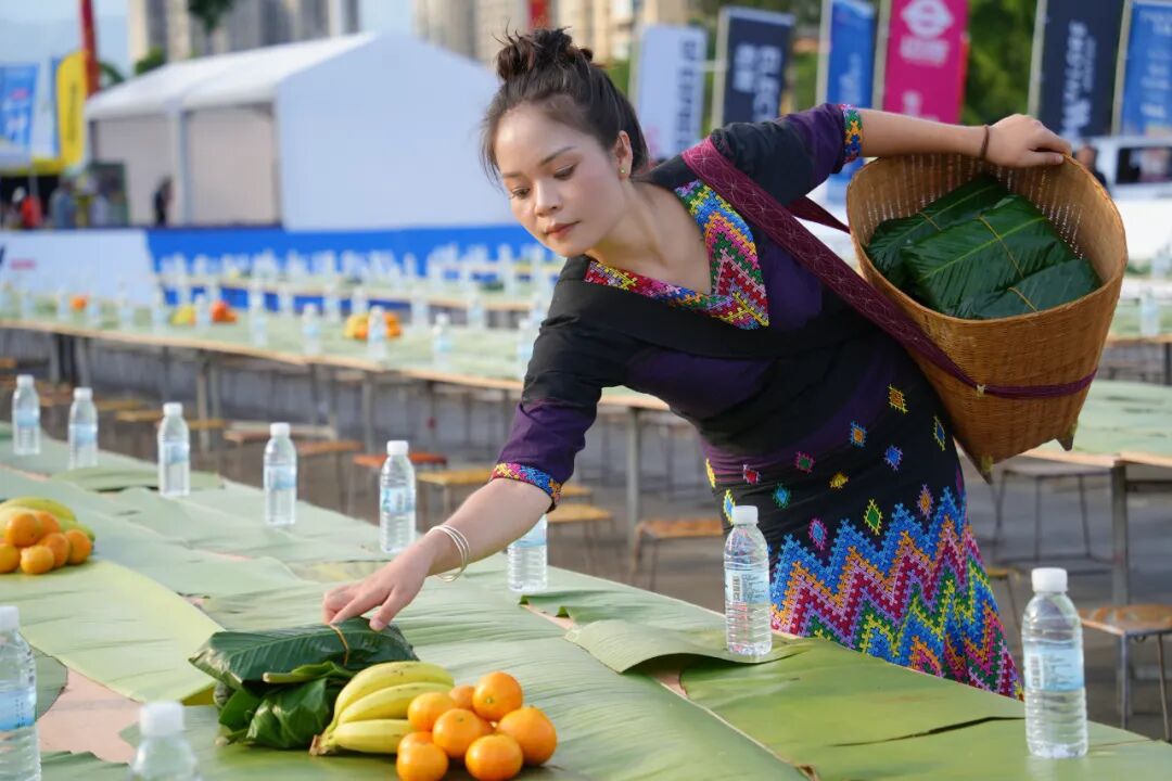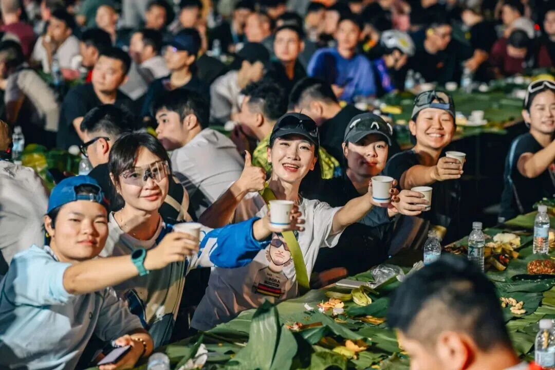 下午4点,工作人员就开始铺设长桌摆放餐食和水果。一份绿叶宴,配置了油淋干巴、牛肉凉片、泼水粑粑、辣腌菜、傣家香米饭等特色菜肴,饱含了芒市招待五湖四海自行车友的热忱与诚意,成为赛事文化体验的重要组成部分。