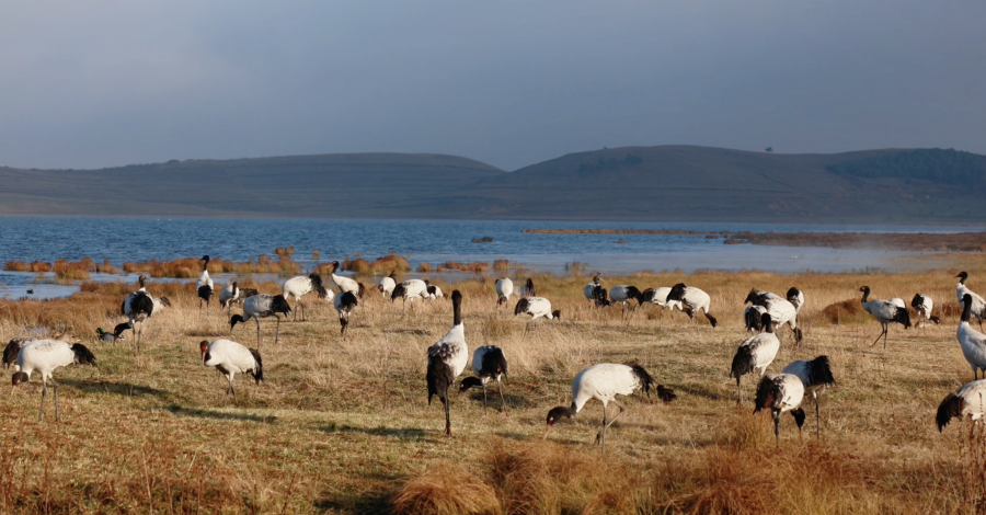 近日,摄影师在云南大山包黑颈鹤国家级自然保护区内,记录到黑颈鹤在湿地附近活动的场景。在群山环抱间,黑颈鹤漫步在澄澈的湖水边,或自在飞翔,或悠闲踱步,或四处觅食,呈现出一派生机勃勃之景。