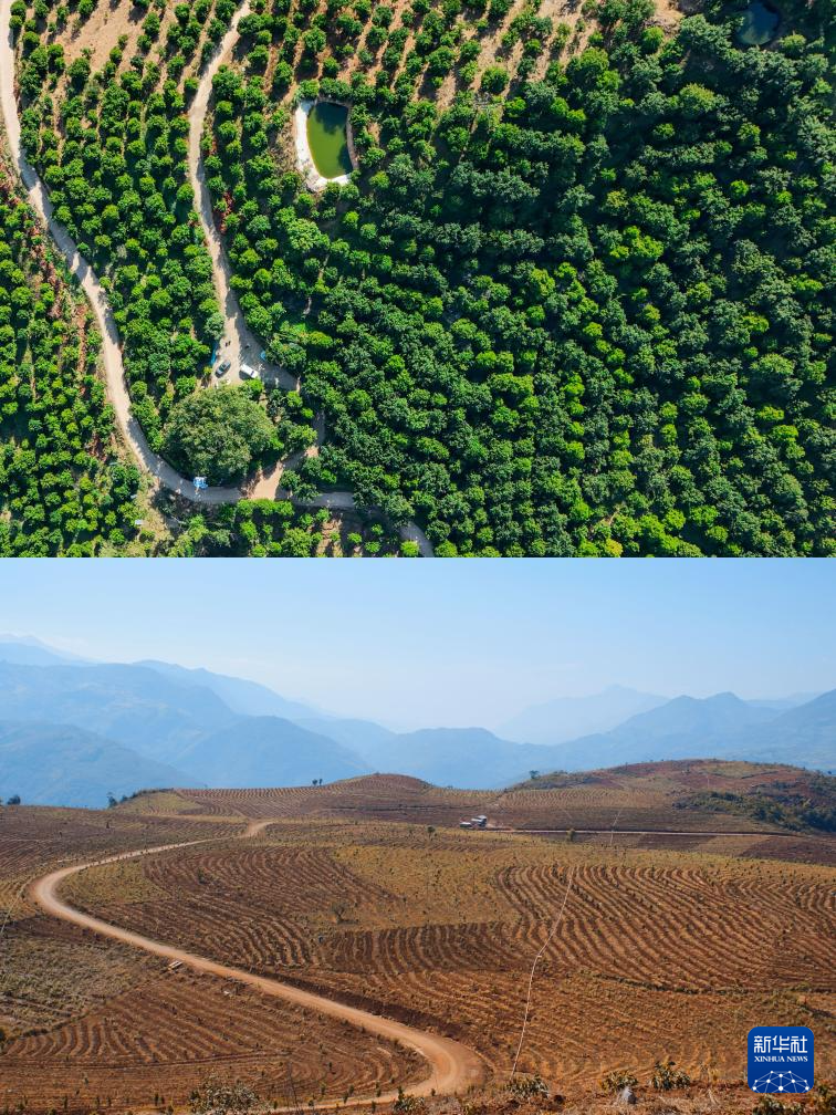 这是一张拼版照片。上图:云南省临沧市永德县的坚果树种植林(无人机照片,2026年1月6日摄,新华社记者彭奕凯摄);下图:2001年在云南省临沧市永德县拍摄的早期坚果树种植林(资料照片)。新华社发