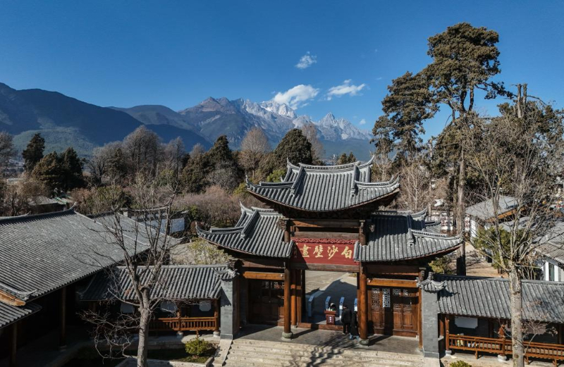 1月16日在云南省丽江市白沙镇拍摄的玉龙雪山和白沙壁画博物馆(无人机照片)。