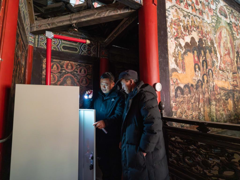 1月15日,杨志坚(左)与同事在白沙壁画博物馆检查大宝积宫消防设施。