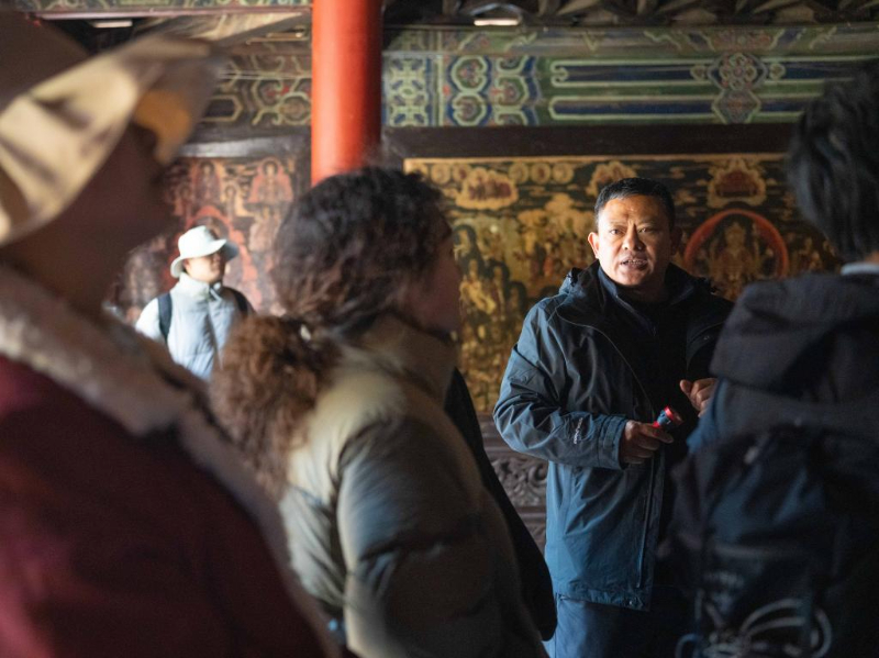 1月15日,杨志坚(右二)在白沙壁画博物馆大宝积宫为游客讲解。