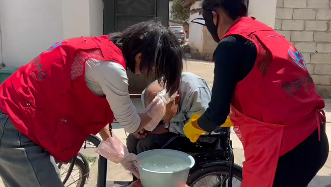 工作人员为老人洗头。(恒益社会服务中心 供图)