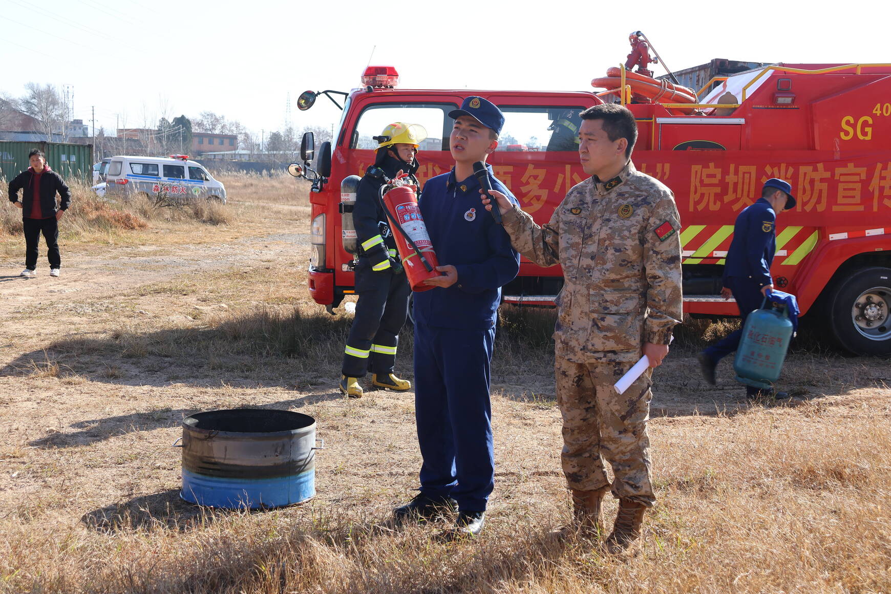 演练结束后,现场还设置了消防器材实操与安全知识普及环节,区消防救援大队指战员现场演示了灭火器、液化气罐火灾扑救等操作要领。