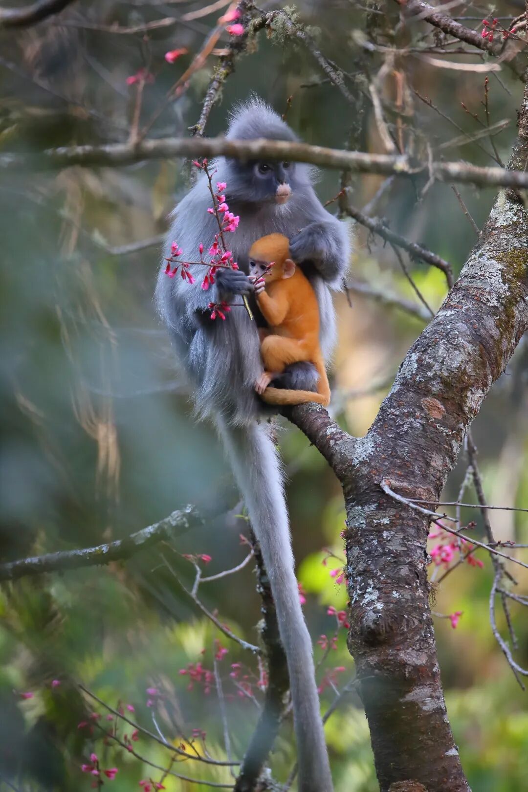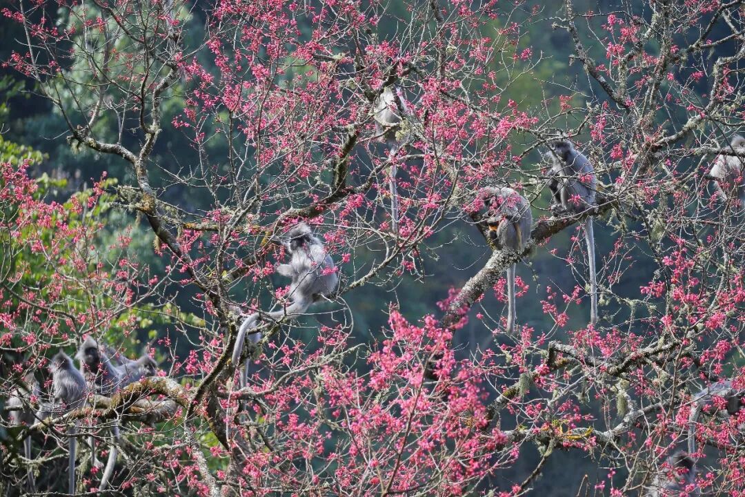每年11月至次年1月,云南无量山国家级自然保护区景东片区内,冬樱花竞相盛开。国家一级重点保护野生动物印支灰叶猴举家出动采食冬樱花,如此场景,总会吸引摄影爱好者前去拍摄。