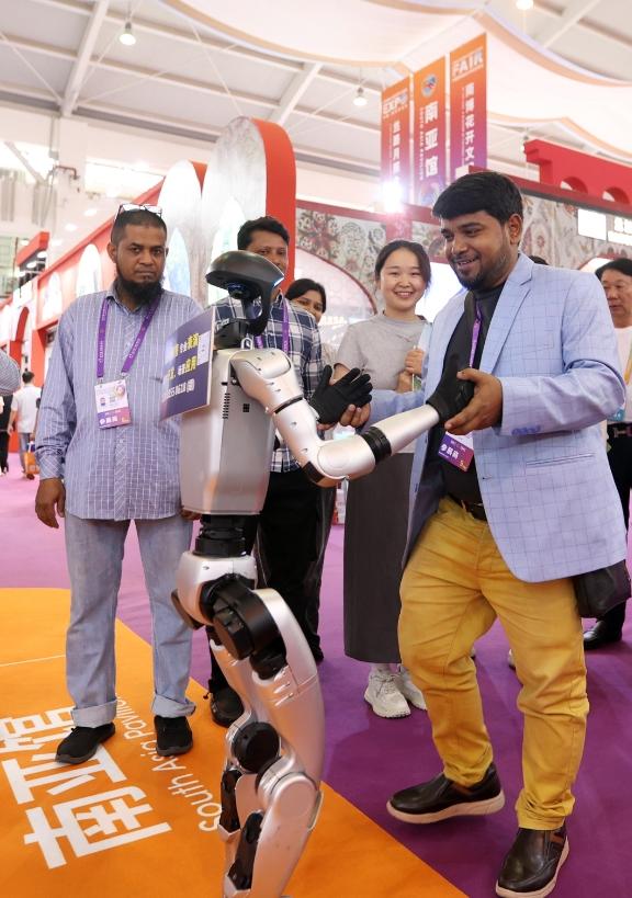 第9届南博会上,外国参展商与机器人互动。 记者 陈飞 摄