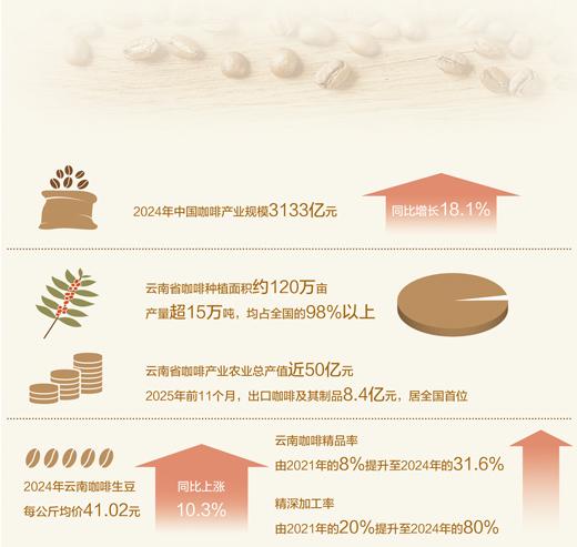 云南省咖啡种植面积约120万亩,产量超15万吨,均占全国的98%以上,咖啡产业农业总产值近50亿元;昆明海关统计,2025年前11个月,云南出口咖啡及其制品8.4亿元,居全国首位。一组组数据无不印证了这句话:“云南咖啡还是代表着中国的”。