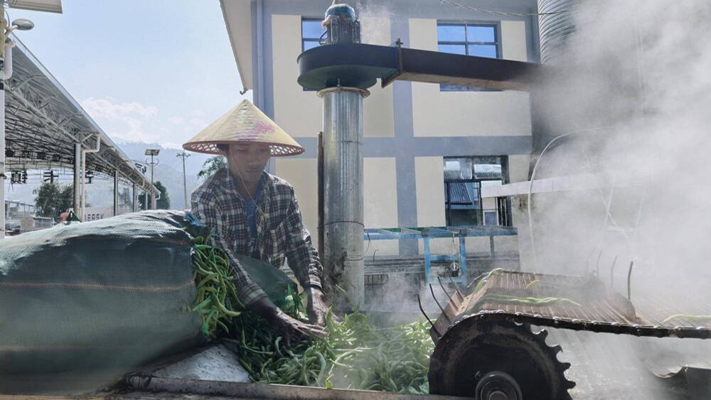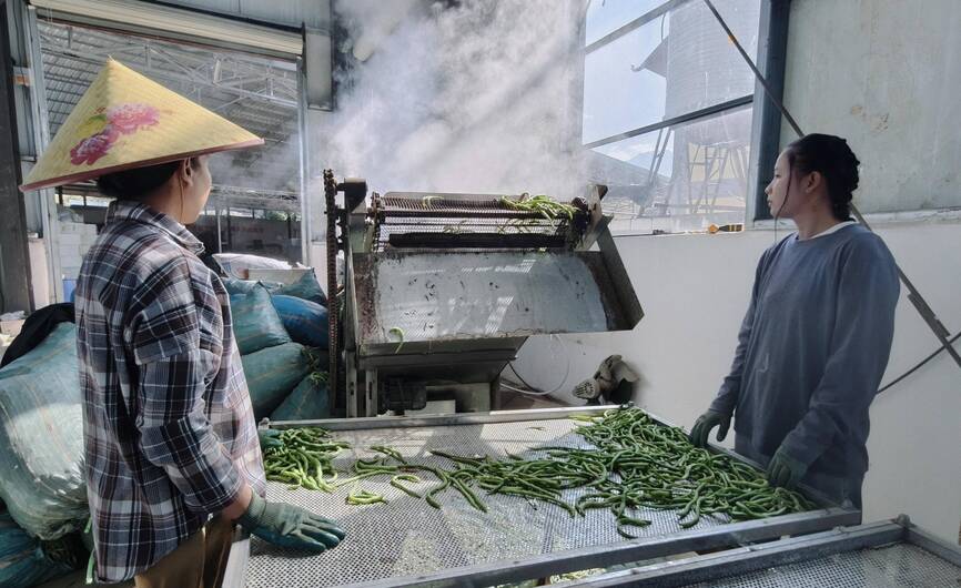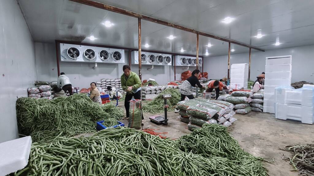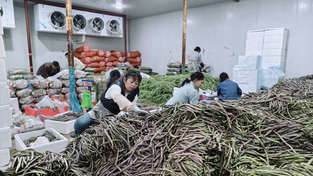 在另一侧的烘干车间里,带着田间鲜气的豆角被送入生产流水线,蒸汽裹挟着豆香升腾而起,豆角均匀受热,褪去青涩的同时锁住养分。“过去本地蔬菜大多只能靠鲜销,受运输限制或市场波动就容易滞销。现在通过冷冻和烘干,我们的蔬菜能卖到东北等地。”王亮指着车间外的货车介绍,春节期间正是蔬菜需求旺季,大家都放弃休假,确保每天新鲜蔬菜发往内地。