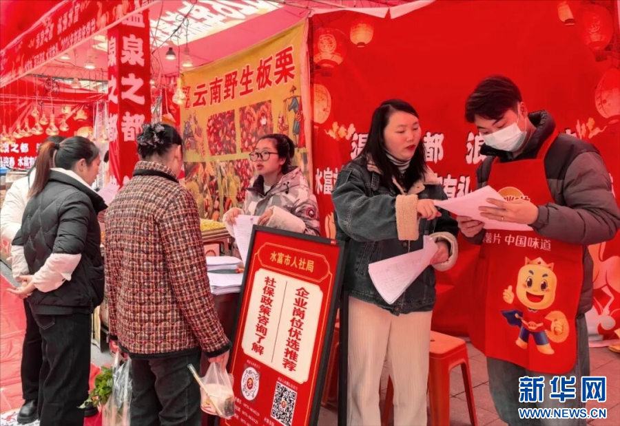 求职者在水富市年货街的就业社保服务点咨询(2月6日摄)。