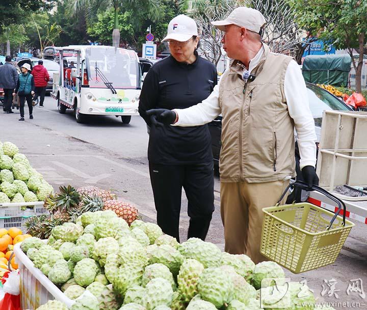 旅居元江的白利夫妇到农贸市场买蔬果。