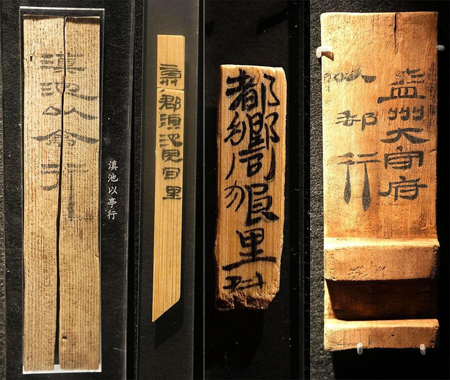 从左至右分别是:“滇池以亭行”简牍、“益州郡滇池戹同里”简牍、“都乡同狼里”简牍(仿制品)、“益州太守府以邮行”检(仿制品)。拍摄于 “从西南夷到益州郡——战国秦汉时期的云南”展