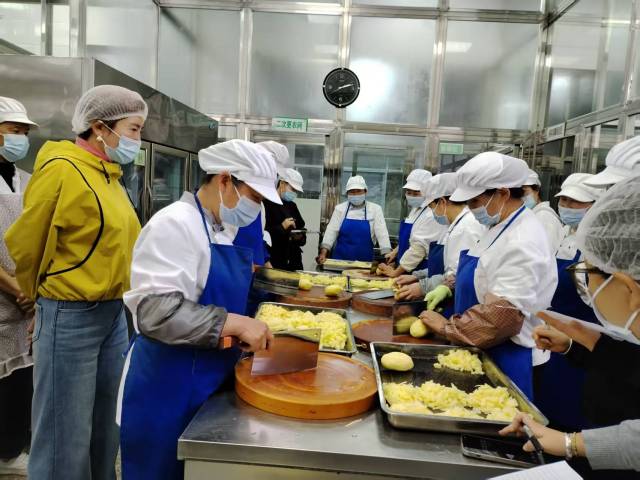 中午12时30分,食堂操作区内,一场“洋芋”的刀工对决拉开帷幕。食堂师傅们围绕切片、切丁、切丝三个项目展开技能比拼。比赛过程中,食堂师傅们精神饱满、动作娴熟,手持刀具沉稳操作,切菜动作行云流水,尽显扎实基本功。评委小组严格按照评分标准细致打分,洋芋切片结合厚薄均匀度与操作时长综合评定,切丁、切丝分别从大小规整度、粗细一致性及完成时效进行客观评分。方寸案板之上,每一片、每一粒、每一缕都厚薄有度、大小均匀、形态规整,充分展现出食堂工作人员精益求精的工匠精神与扎实的岗位实操能力,也为幼儿膳食精细化制作打下坚实基础。