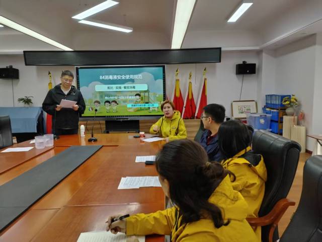 与此同时,在二楼会议室,一场聚焦84消毒液科学配比与餐前消毒规范的保育专题培训同步进行。鉴于我园实行“三教轮保”工作模式,每班派出两名教师参加此次实操培训,确保保育技能覆盖到每一位带班教师。培训现场,杨老师首先围绕84消毒液的配比方法进行了详细讲解,强调了不同场景下的浓度要求及安全注意事项。随后进行的餐前消毒步骤演示中,杨老师按照“清—消—清”的标准流程,完整展示了桌面消毒的全过程。从消毒毛巾的折叠方法、擦拭路线到作用时间的把控,每一个细节都规范严谨。随后老师们移步室外,进行84消毒液现场配制操作及餐前消毒实操并相互观摩、相互点评,现场学习氛围浓厚。